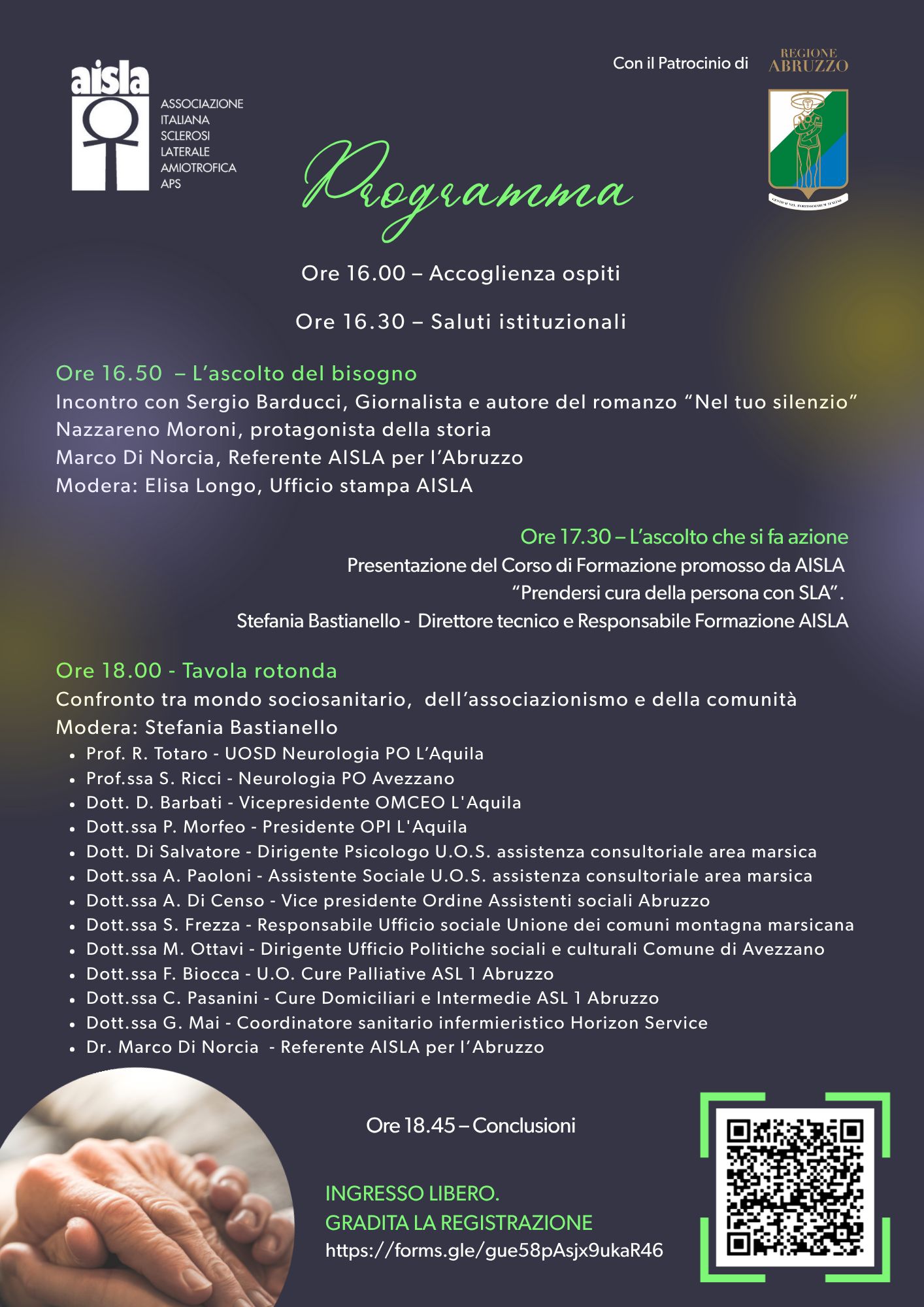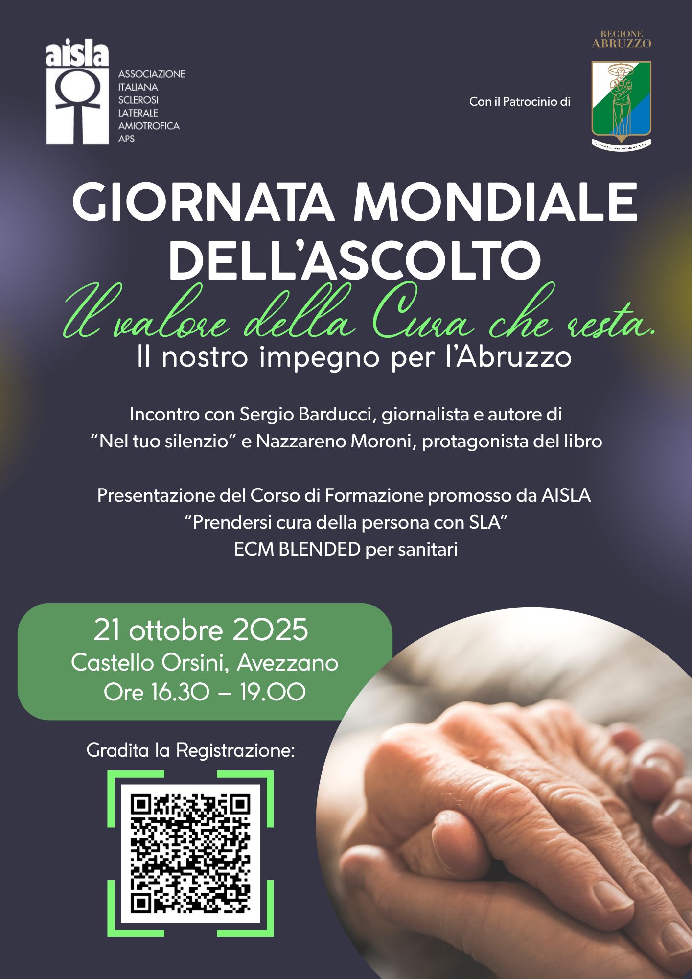 In occasione della Giornata Mondiale dell’Ascolto, l’Associazione Italiana Sclerosi Laterale Amiotrofica (AISLA) ha organizzato l’evento dal titolo: "Il valore della cura che resta. Il nostro impegno per l’Abruzzo" L'iniziativa, dedicata al tema dell’ascolto come elemento fondante della cura, sarà anche occasione per la presentazione del nuovo Corso di Formazione AISLA Abruzzo – “Prendersi cura della persona con SLA” (ECM Blended per sanitari), nato per rafforzare le competenze degli operatori coinvolti nell’assistenza alle persone con Sclerosi Laterale Amiotrofica. 21 ottobre 2025 Castello Orsini, Avezzano Ore 16.30 – 19.00