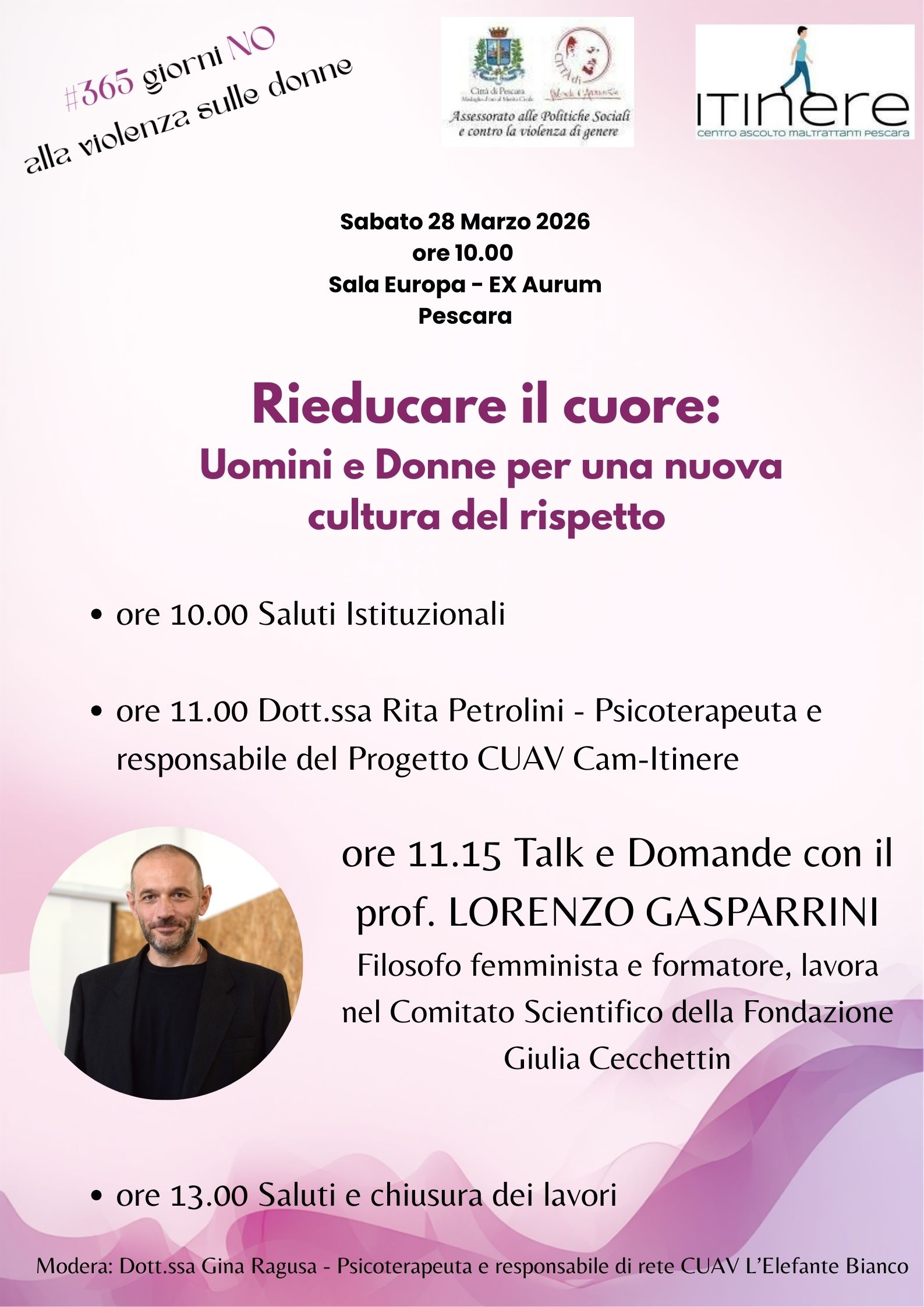 L’evento, incentrato sulla tematica della violenza di genere, rientra nella programmazione della campagna annuale di sensibilizzazione "#365 giorni No alla violenza sulle donne" e si terrà il 28 marzo p.v. alle ore 10 presso la Sala Europa dell'Ex Aurum di Pescara. Tutte le info nella locandina.